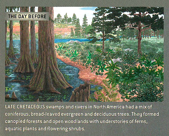 Slideshow of stages of transformation in a landscape within 50 years of the Chicxulub asteroid impact.