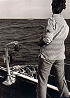 Continuing down I saw a shelf on the slope with fairly flat sandy bottom with all sorts of unidentified artifacts peeking out or outlined under the surface. I descended to the sand- now at 120 feet- and spotted a bronze ship's bell lying half-buried and attached an inflatable buoy on a reel of fishing line and sent it as a marker to the surface. My no-decompression time up, I started to return to the surface and suddenly saw the dark shadow of a guy skin diving hauling down on my buoy line. I didn't see him during my retrieve by Tiercel but once aboard noticed a big workboat had come in and anchored some hundred yards from the reef. It flew a French flag and I presumed they were salvaging artifacts but spunky Sarah volunteered to run the Zodiac over to see what they were about. (These were the days before piracy, hijacking and abductions in the high-seas became worrisome.)