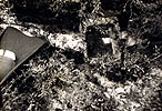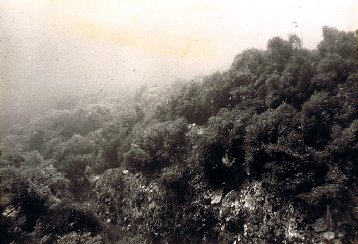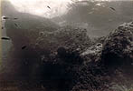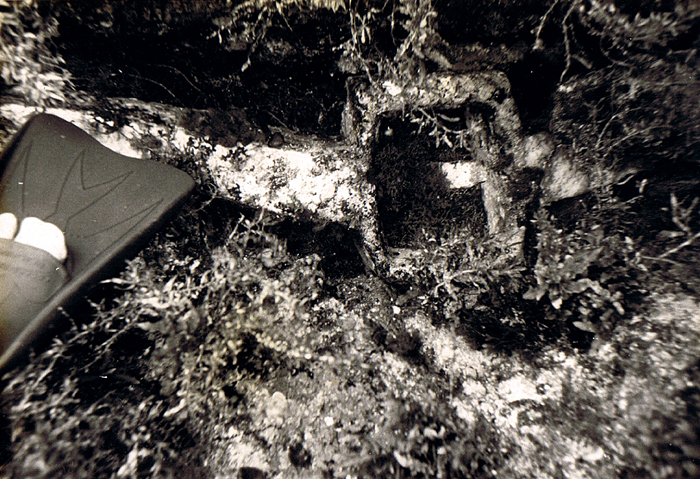 Finally the weather cleared and we made another run back to Cap Bon and back to Keith and this time I was ready to get dropped off with my dive gear and camera as Teircel stood off a safe distance from the reef. The first impression I got of the bottom was a highly irregular, dark, colorless, algae-covered rocky slope of about 35 degrees descending to unknown depths. At this point the depth was about 60 feet so I swam just below surface upslope to find the top of the reef. The first impression was that the site was littered with WW II unexploded bombs of all sizes- stuck where they hit the reef (which with its oblong profile from the air could easily be mistaken for a submarine) Also evident were all kinds of chains running like spokes from the hub of the reef down the slope. Cannon of all shapes and sizes were scattered everywhere. As I came to the top of the reef where the rocks probably had likely been bombed down to just below the level of the sea surface on a calm day, I saw evidence of fresh keel and impact scars in the rocks. This may have accounted for the failure of previous expeditions to find the reef. Winds had to be just right so that the only breakers would be over the reef. If seas were too calm nothing would be visable. Searching with a fathometer on a large vessel underway would be highly hazardous as the reef rises abruptedly from the surrounding banks. I took some pics around the top of the reef and then started a transect down the east slope. At about 40 feet I spotted a Roman lead anchor stock and took its picture.